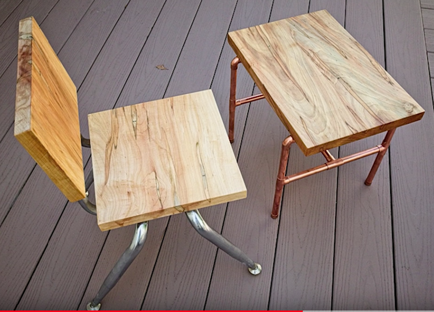 Using Ambrosia Maple with it beautiful grain pattern I reseated and backed this child's old school chair. Also using Ambrosia Maple I created a short table but this time I made a custom set of legs using copper tubing.